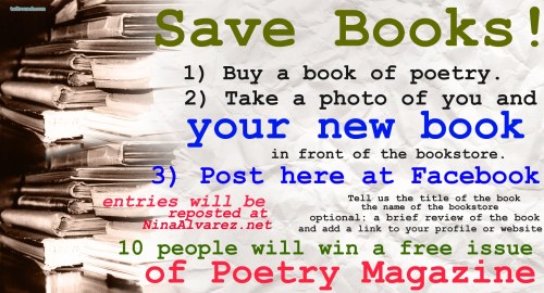 In honor of reaching 100,000 readers, in honor of 4 years of NinaAlvarez.net, Poetry Month in April, because I am pissed about Borders, and mostly in honor of the life of BOOKS!